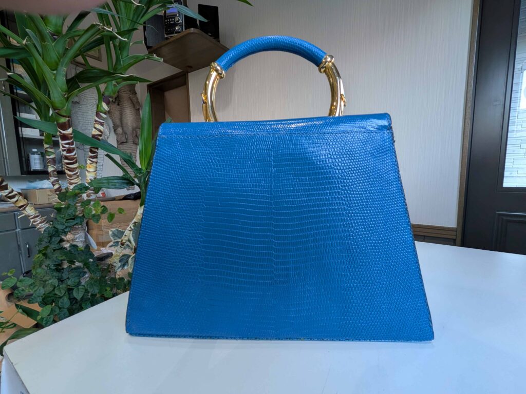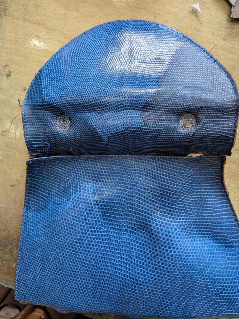 湿気取りの液漏れで硬化・縮みしたリザードバッグを完全再生|革の張り替え修理事例